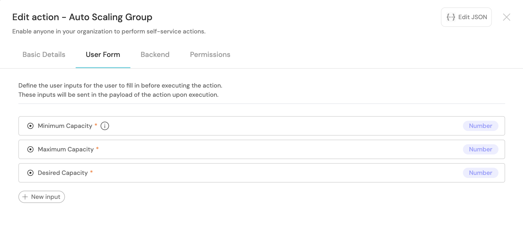 ec2Instanceblueprint: - Head to the self-service page. - Click on the+ New Actionbutton. - Click on the{...} Edit JSONbutton. - Copy and paste the following JSON configuration into the editor: