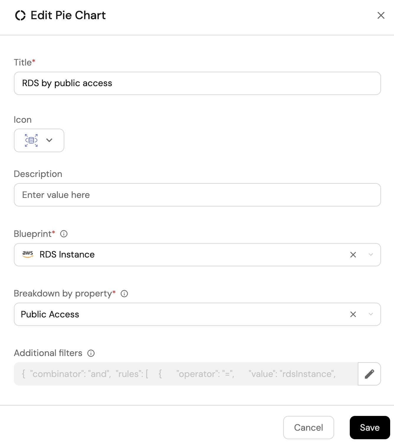 - Add this JSON to the Additional filters editor to filter insecure RDS instances: