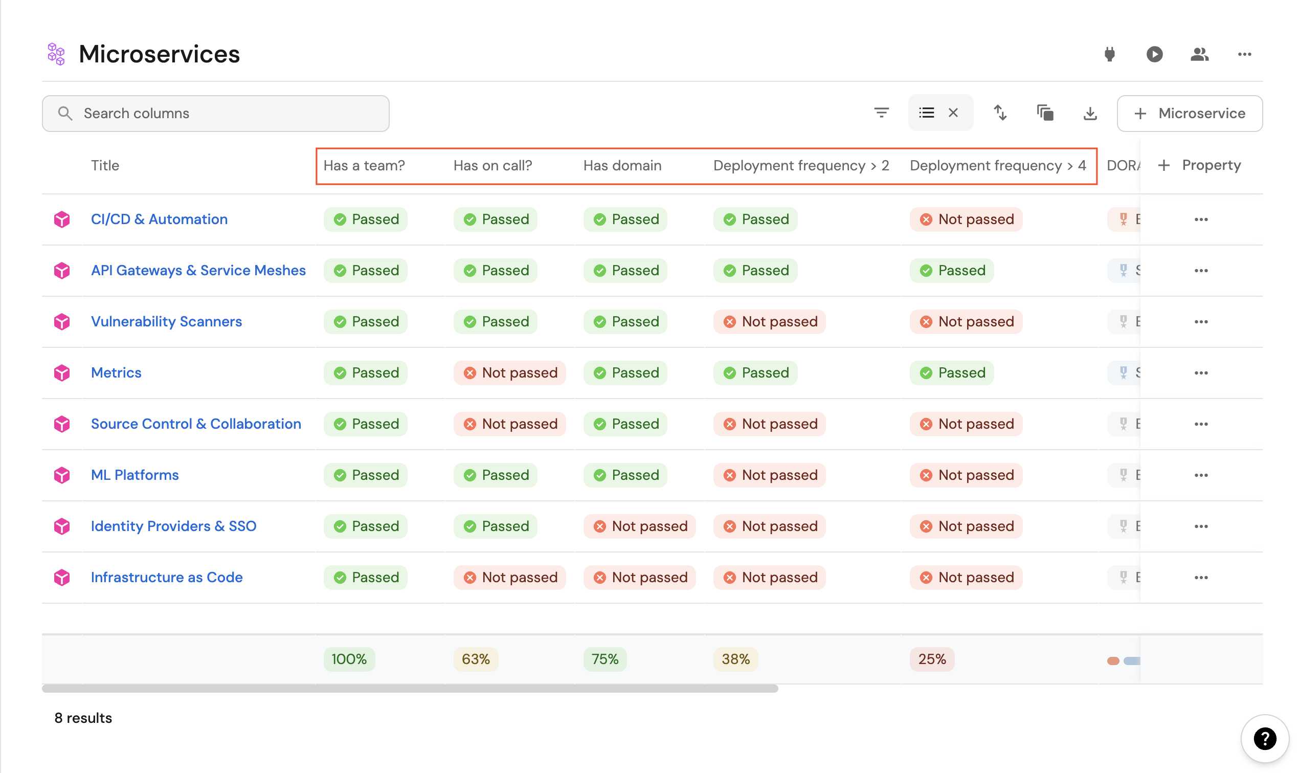 For example, these microservices have some rules defined in their scorecards, and we can see that: