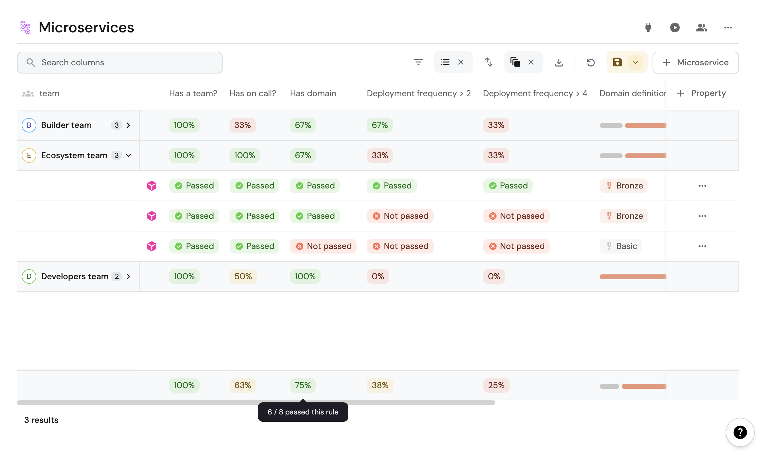 • The bottom of the table contains an aggregation of the results of each rule for all microservices (across all teams). Six out of eight microservices in total have a domain configured.