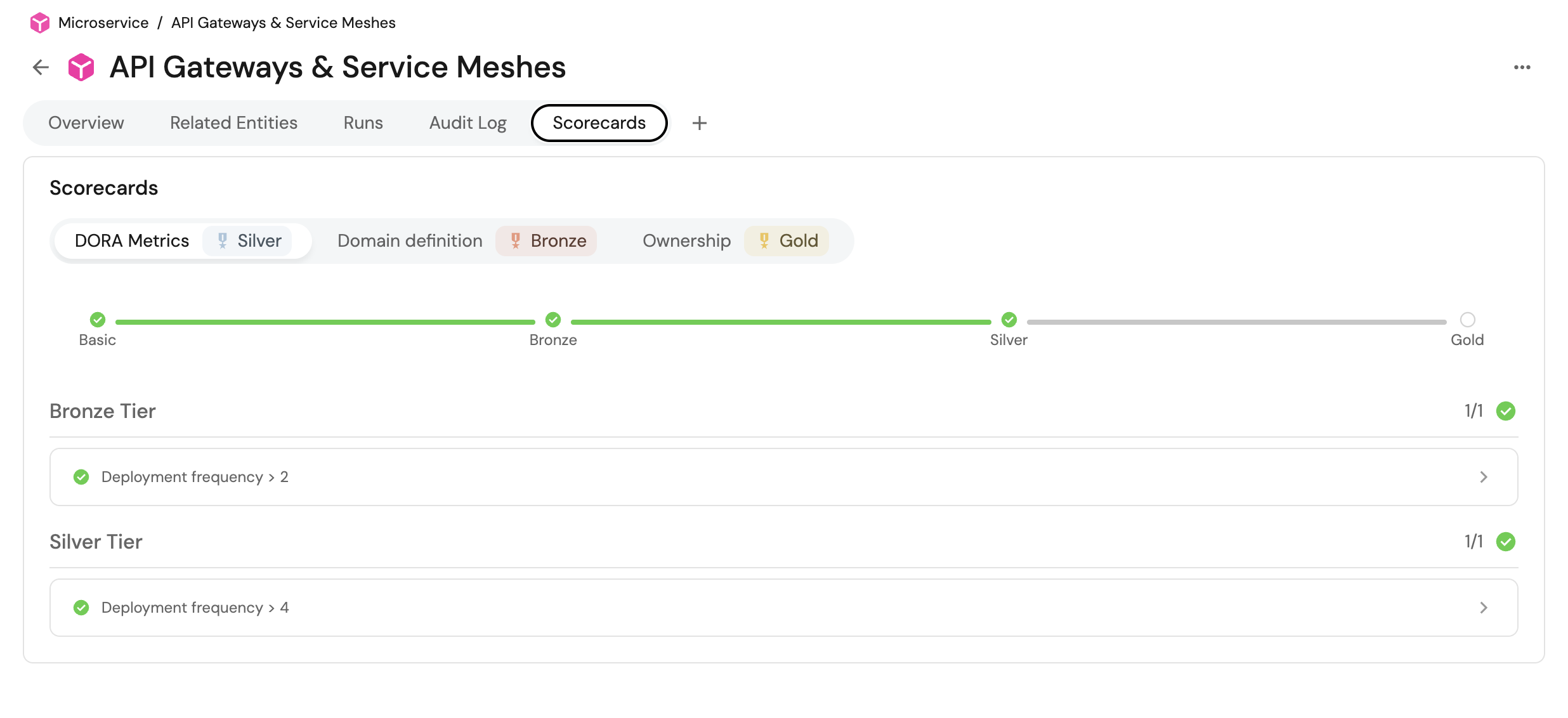 Each entity with a configured scorecard will have a scorecards tab in its entity page, detailing the different checks and their results: