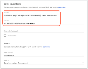 ACS URL-https://auth.getport.io/login/callback?connection={CONNECTION_NAME}Entity ID-urn:auth0:port-prod:{CONNECTION_NAME}